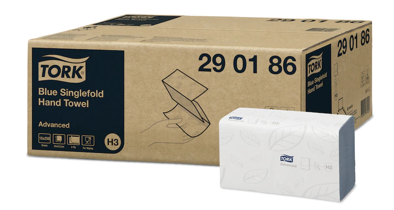 Satisfy hand drying needs with the Advanced Tork Singlefold Hand Towels ensure the right quality for when cost and performance are equally important. These towels are suitable for the Tork Singlefold Hand Towel Dispenser for demanding environments. Help control consumption and promote good hygiene with reliable one-at-a-time dispensing. Attractive Tork Leaf decor: designed to make a great impression. Advanced quality for cost savings and high performance. Many towels per bundle: Serves more and requires less frequent refilling. One-at-a-time dispensing for reduced consumption and increased hygiene. 250 x 23cm x 22.5cm sheets per sleeve. 15 x sleeves per pack. 2-ply. 3750 towels per case. Blue.
